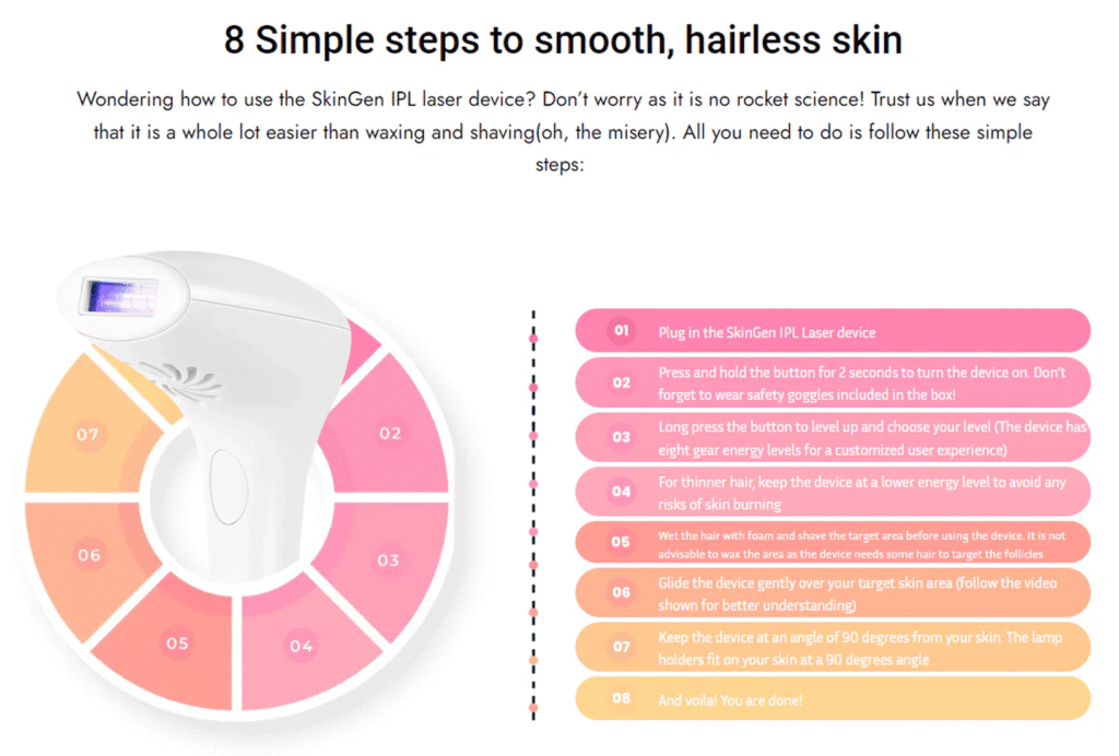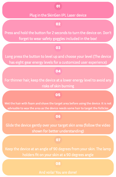 Curious about how to use your IPL Laser Device? Don’t worry—it’s easier than you think! In fact, it’s much simpler (and less painful) than waxing or shaving. Just follow these 8 quick steps to get started: